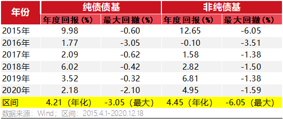 如下表所示,纯债债基平均年化回报为4.21%,最高回撤-3.05%;非纯债基平均年化回报4.45%,较纯债债基略高,最高回撤-6.05%也大于纯债债基。