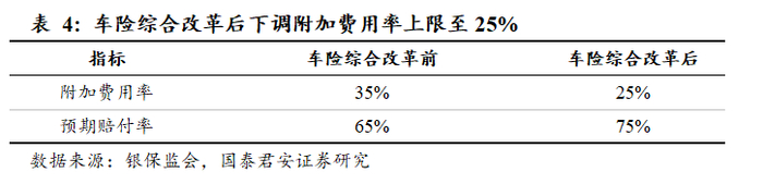 2) 下调附加费用率上限至25%:为实现压缩费用率提升赔付率的总体目标,此次车险综合改革监管将产品的附加费用率上限由35%下调至25%,预期赔付率由65%提高到75%。
