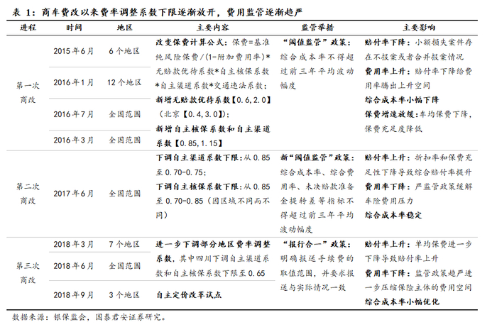 商车费改实施的本质是要在保险公司实现承保盈利的基础上尽可能降低费用水平,让利消费者。总体经历三个阶段:1)第一次商改(2015年6月至2017年5月):构建商业车险保费计算公式,发布基准纯风险保费表,从6个地区试点逐步推广至全国;2)第二次商改(2017年6月至2018年3月):扩大自主核保系数和自主渠道系数的范围,全国范围内实行差异化政策;3)第三次商改(2018年3月至2020年9月):进一步扩大自主核保系数和自主渠道系数范围,其中广西、陕西、青海三地完全自主定价,实现部分地区完全市场化竞争。