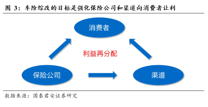 综改的目标是强化保险公司与渠道向消费者让利:车险市场化改革本质上是保险公司、渠道和消费者三者之间的利益再分配。2015-2019年商车费改的重点是通过“阈值监管”、“报行合一”等方式严管渠道费用,实现让利消费者;本次车险综改最大的变化在于监管适度提升行业承保盈利波动的容忍度,进一步强化险企和渠道向消费者让利。