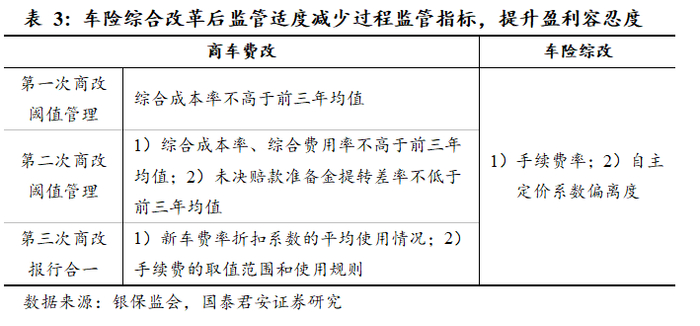 为确保保险公司达成预期目标,监管分别在三个阶段的改革中引入过程管控的举措,引导保险公司在降低费用的同时实现承保盈利。1)第一次商改时提出“阈值监管”,建立商业车险条款费率检测调整机制,重点监测综合成本率;2)第二次商改发布新“阈值监管”政策,综合监管财险公司的综合成本率、综合费用率、未决赔款准备金提转差等指标,缓解费用无序竞争;3)第三次商改推出“报行合一”,明确报送手续费的取值范围,并要求报送与实际情况一致,进一步压缩保险主体的费用空间。