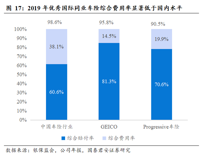 借鉴海外成熟车险市场发展经验,美国GEICO、Progressive等国际先进车险公司的综合费用率远低于国内车险行业,均维持在20%以下,给赔付支出留有较大空间,承保盈利水平良好。