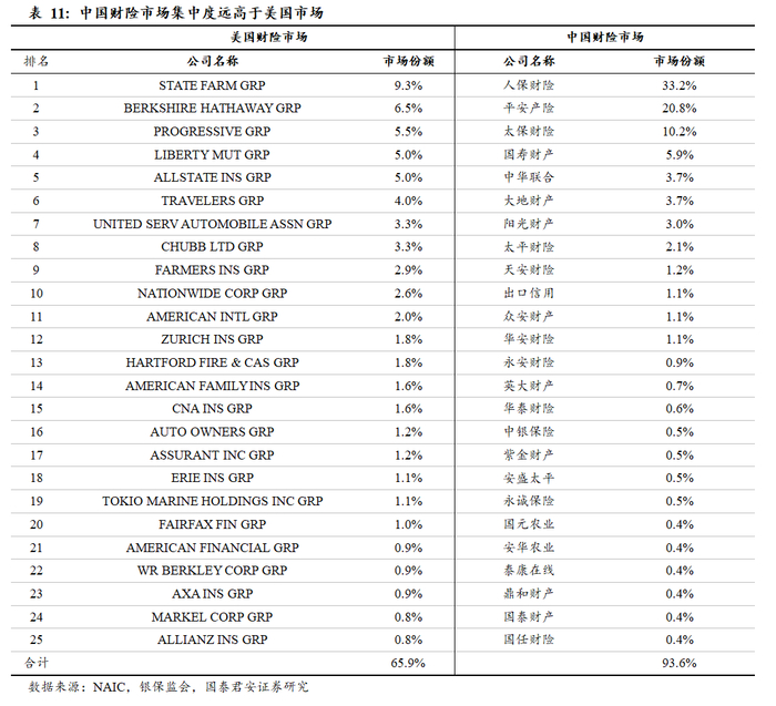 以美国市场为例,美国财险市场高度开放及分散,保费排名前25的财险公司市场份额之和约为65.9%,其中最大的州立农场保险公司市场份额仅为9.3%,大幅低于中国最大的财险公司人保财险33.2%的市场份额。从细分领域来看,美国车险在整体财险中的占比在40%左右,显著低于中国车险60%以上的车险占比,绝大多数中小财险公司均为聚焦某个非车险细分市场,走差异化、专业化发展道路。