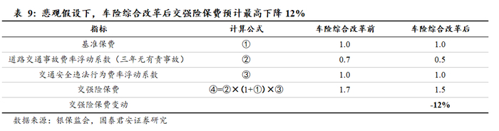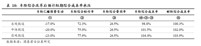 2) 综合费用率:根据我们调研,在车险综合改革实行后手续费率已出现明显下降,我们假设综合费用率较改革前下降12.5pt。