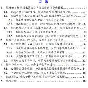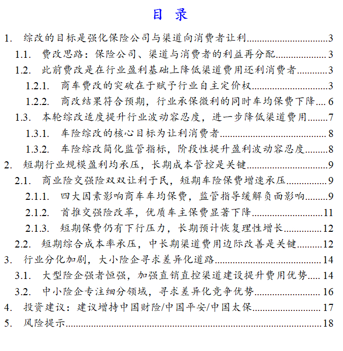 风险提示:车险保费增速大幅低于预期;政策落地及配套措施不及预期;市场竞争压力及中介渠道话语权过强导致费用率下降不及预期。