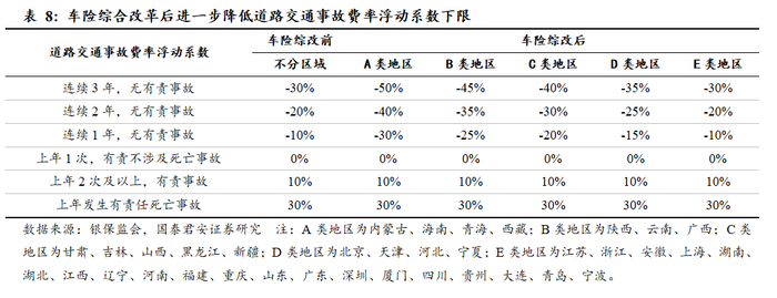 根据我们测算,1)悲观假设下,即车主连续3年未发生有责事故,在A类地区(内蒙古、海南、青海和西藏等四个地区)的道路交通事故费率浮动系数将由-30%下调至-50%,预计最高减少当期交强险保费12%;2)乐观假设下,E类地区以及上年发生过1次及以上道路交通事故的情景下交强险保费将保持不变,预计交强险保费不变。因此简单平均下预计行业整体交强险保费下降6%左右。