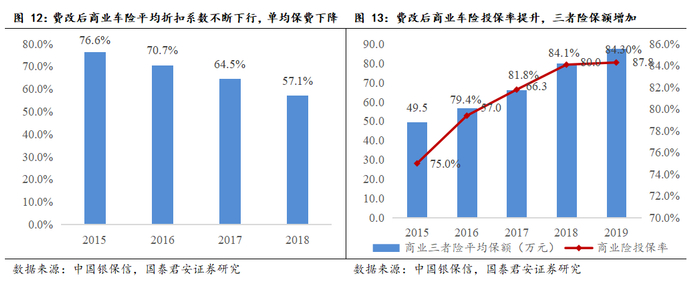 保费端来看,商改后客户车均保费下降的同时投保意愿提升,行业车险保费仍延续增长。一方面,随着决定车均保费的无赔款优待系数、自主核保系数和自主渠道系数的浮动下限逐步降低,车险保费充足性不断下降,2015-2018年商车平均折扣系数由0.766下降至0.571,行业主体的业务发展速度有所放缓;另一方面,商改后消费者普遍受益,客户平均保费支出下降,推动保全保足的意愿明显提升。2019年,商业车险客户的三者险平均保额达87.8万元,较2015年实现复合增速15.4%。