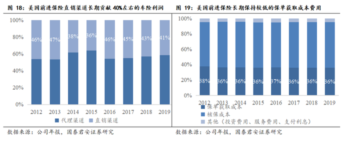 从费用的具体构成情况来看,财险公司的费用投入主要包括保单获取成本、核保成本和其他。以Progressive为例,公司的费用主要用于核保成本,占比长期维持在60%左右,而保单获取成本的占比保持较低水平,在35%左右,主要原因是公司拥有强大的电网销直销渠道,有利于公司降低中介渠道的费用支出。公司2019年直销渠道贡献41%的车险利润(代理渠道贡献59%),整体保单获取成本仅为7%。