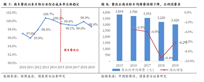 三次商车费改的结果总体符合监管预期,车险行业维持承保微利,2015-2019年车险综合成本率维持在98.6%-99.9%之间;同时消费者的车均保费呈现下降态势,2019年商业车险单均保费为3,020元,较2015年费改前复合增速下降5.8%。
