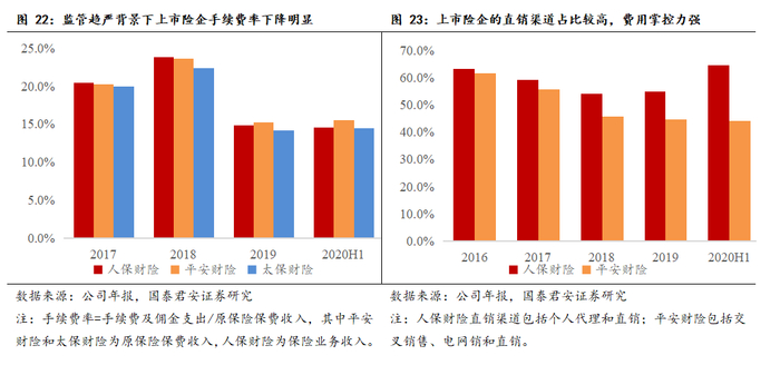 上市险企综合费用率下降主要来自于商车费改深化背景下,各家公司手续费率有较大的压缩空间,截至2020年上半年,人保财险、平安财险和太保财险的手续费率分别为14.6%、15.6%和14.5%,分别较2017年末下降5.9pt、4.7pt和5.5pt。这主要来源于大型险企拥有强大的直销直控渠道建设体系,通过重点强化以电网销、直销和车商渠道为代表的直销直控渠道建设实现手续费率的大幅缩减。截至2020年上半年末,人保财险和平安财险的直销渠道占比分别达64.7%和44.2%,对降低手续费提升承保盈利能力起到重要作用。