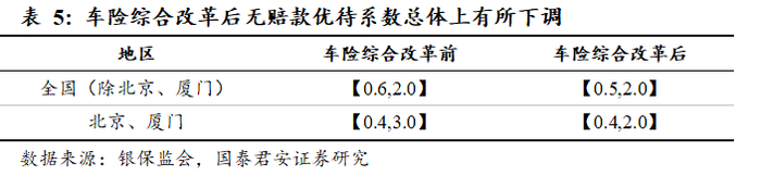 3) 无赔款优待系数对偶然赔付消费者降低费率上调幅度:此次车险综合改革将考虑赔付记录的范围由前1年扩大至前3年,并降低对偶然赔付消费者的费率上调幅度,总体上无赔款优待系数有所下调。