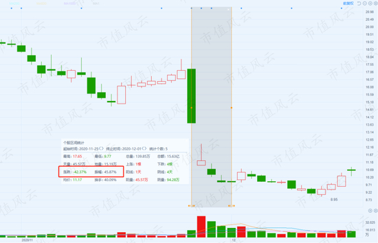 尤其是11月25日午盘出现坠崖式暴跌,当天20%跌停收盘,26日早上开盘即跌停,随后不知哪路神仙动用近1亿元资金翘板,并引发跟风盘,才不至于再度出现踩踏行情,但这两日累计跌幅也高达34%。