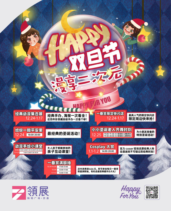 在12月24日-1月17日,还将带来“一番赏限定季”双旦狂热活动,经典的动漫人物汇聚一堂、不同时代的经典人物闪现而来,让消费者重新燃起青春的热血!同时,在12月24-26日以及1月1日-2日还有手绘小课堂、派发平安果、cosplay大赏等精彩新潮主题活动,瞬间成为京城漫迷集散地!