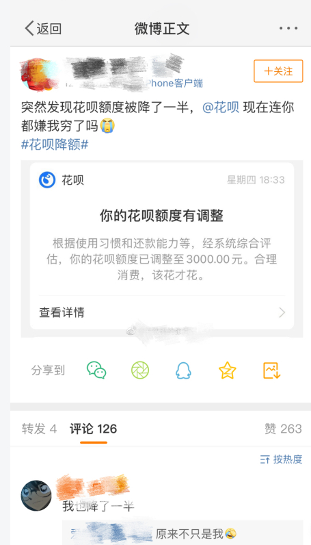 近期,一些网友在社交媒体上晒出截图,表示自己的花呗额度被降低了,不少网友反馈额度被降到了3000元以下。