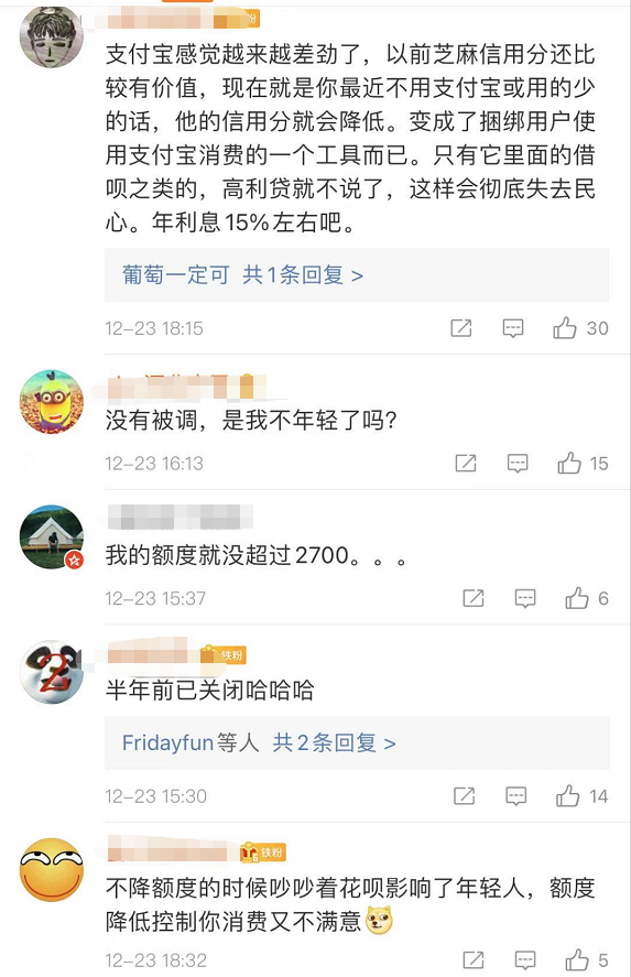 针对有部分网友称其花呗额度被降到了2000元或3000元一事,蚂蚁集团12月23日回复称,花呗近期正在调整部分年轻用户的额度,倡导更理性的消费习惯。