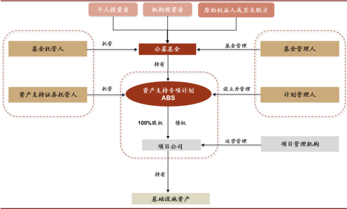 中国REITs目前采用“公募基金+ABS”架构,与海外典型REITs产品有所差异,但是目前法律层面通行阻力最小的方案。中国REITs产品的最大特殊性在于以“公募基金+ABS”的方式持有项目公司股权(海外通常由顶层基金主体直接,或通过特殊目的载体持有项目公司股权)。自下往上看,ABS持有项目公司100%股权(和债权),公募基金持有ABS全部产品份额,再由投资人持有公募基金份额,完成整个产品结构搭建。