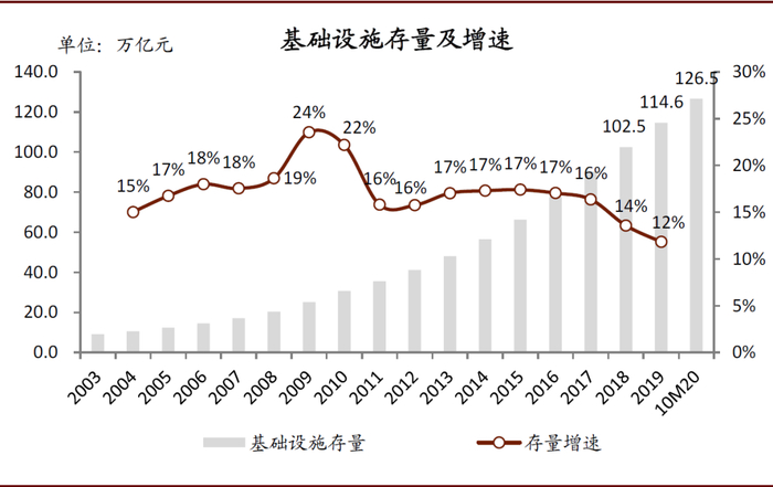 注:仓储物流、公路、铁路、地铁、互联网数据中心数字截至2019年底,其他截至2018年底。资料来源:国家统计局,中金公司研究部