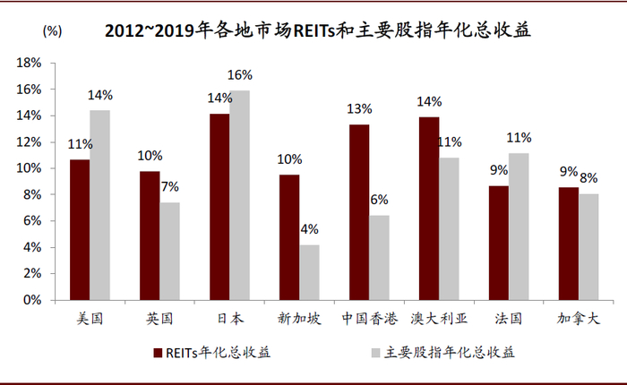 全球视角看,REITs仍是相对年轻的资本市场品种,但已经是重要组成部分。目前世界上已有44个国家和地区推出REITs产品,但大部分创设于2000年代,整体历史不长。2019年底全球公募REITs市值约2万亿美元(其中美国是主体市场)。从各国家和地区公募REITs市值对当地股市总市值的角度来看,2019年底该比例最高的国家是新加坡(REITs市值占股市总市值16%),澳大利亚和美国的占比分别在7%和4%左右,日本、法国、加拿大、英国等国家的该比例在3%左右,已经不低。