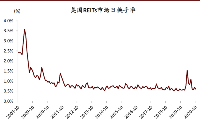 图表:近年来美国REITs市场日换手率维持在0.7%-0.8%