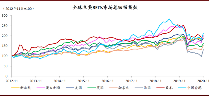 图表:尽管各股票市场整体表现分化,投资REITs的收益相对稳定