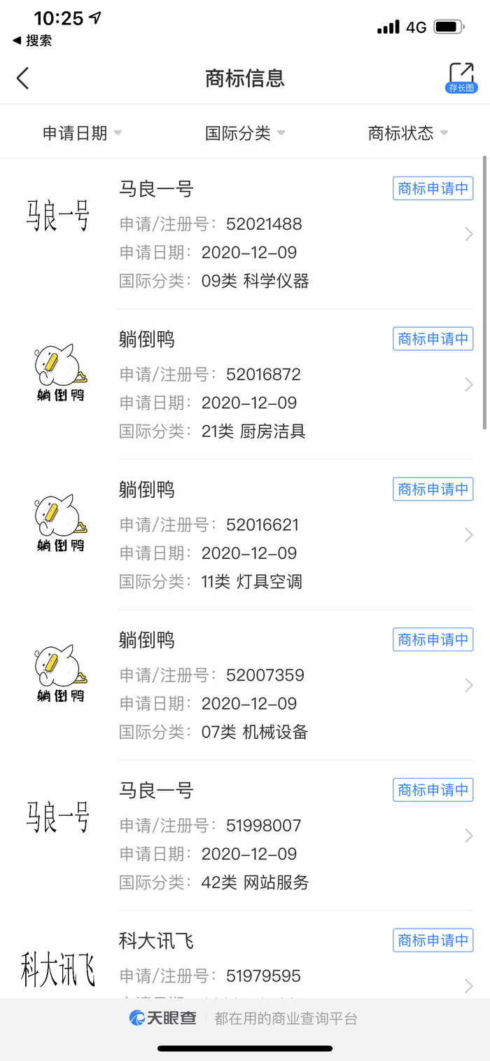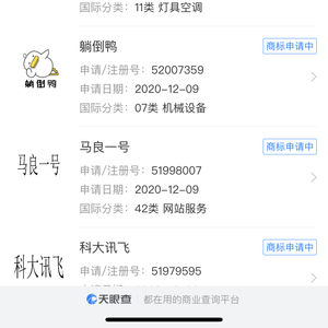 据天眼查App显示,科大讯飞股份有限公司新增申请多条“躺倒鸭”的商标信息。商标涉及的国际分类包含灯具空调、机械设备、厨房洁具,申请日期均在2020年12月9日,目前商标状态为“商标申请中”。