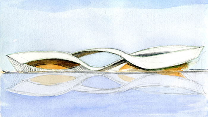 “我想利用中轴线去回应场地,通过创造一个‘Arch拱门’,也就是现在大家看到的‘飘带’,以此打造一个同时面向湖面和城市的窗口。‘飘带’为行人提供了遮蔽空间,同时行人可以走到‘飘带’之上去发现城市。”包赞巴克说。