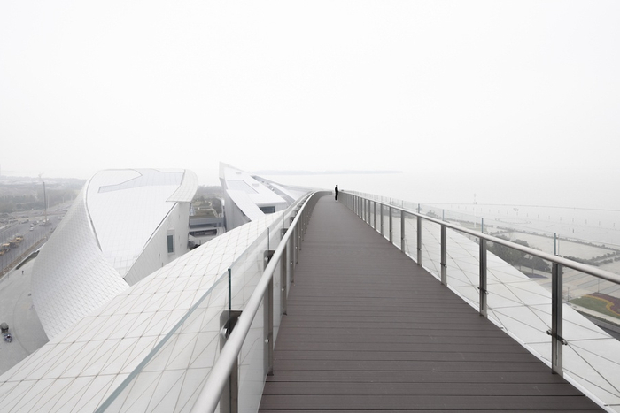 行人可以沿着“飘带”从建筑屋顶走到太湖湖畔。
