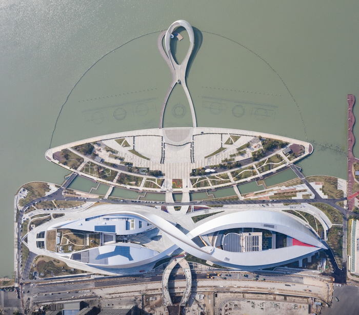 从空中俯瞰苏州湾大剧院,苏州湾大剧院就像用一条“飘带”构成的“∞”。