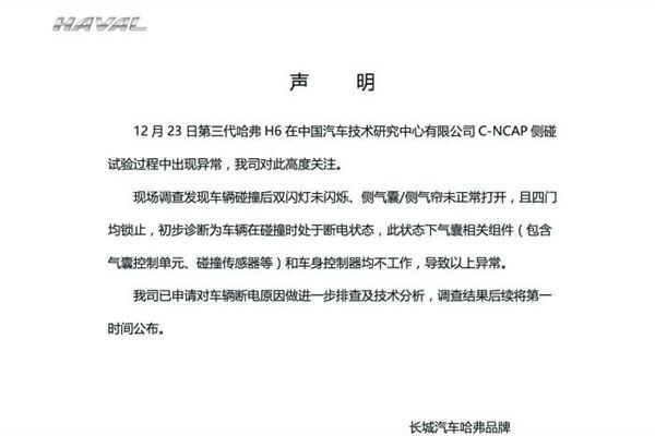 长城汽车哈弗品牌表示,初步诊断为车辆在碰撞时处于断电状态,导致侧气囊和侧气帘没有弹开。长城汽车进一步声明,欢迎全国有资质的检测机构随意抽取市场中的第三代哈弗H6进行碰撞,验证产品安全性。
