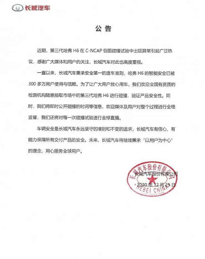 近期,第三代哈弗H6在C-NCAP侧面碰撞的试验中侧气囊和侧气帘未弹开引发广泛关注。今日,长城汽车和哈弗品牌均对此事作出回应。