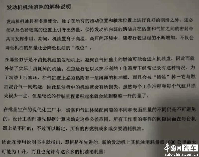 此外,4S店工作人员还对该车的车子气缸压力和火花塞也进行检查,并表示会将车子检查情况反馈给上汽大众厂家,让赵女士等回信。与此同时,还给赵女士出具了一份厂家提供的《发动机机油消耗的解释说明》,但赵女士对其中所谓“机油消耗量每1000公里最大可能为1升,且允许有这么多的机油消耗量”的解释并不认可,她认为自己的POLO烧机油的情况已经超出了可以接受的范围。