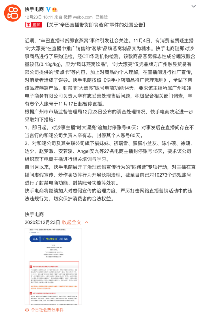 “糖水燕窝”事件尘埃落定:辛巴被罚90万元 快手账号封禁60天