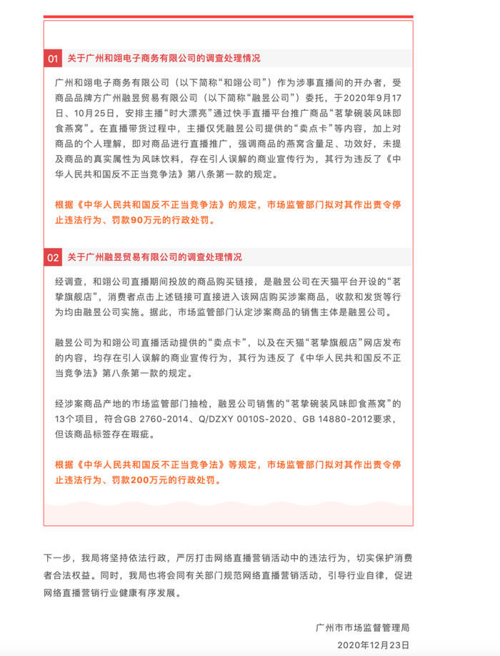 “辛巴直播带货即食燕窝”事件终于有了结果。12月23日,广州市场监管部门拟对辛巴旗下和翊公司作出责令停止违法行为、罚款90万元的行政处罚。
