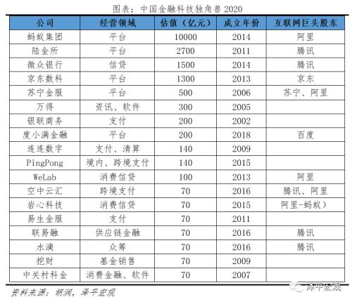 分企业看,中国金融科技市场格局寡头化。不同于其他国家和地区金融科技以中小型公司为主,中国金融科技市场结构趋向少数大型企业主导。《2020胡润全球独角兽榜》显示,18家金融科技行业独角兽企业估值共计16340亿元。
