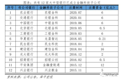 大中型银行成立金融科技子公司。各大银行在深化与外部科技企业合作的基础上,注重加强自身科技实力,成立金融科技子公司整合技术、业务、资源及经验优势,对内对外输出技术能力,提升整体数字化水平。截止2020年11月,国有五大行及七家股份制银行已成立独立的金融科技子公司。