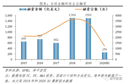 全球金融科技投融资2018年达到顶峰。根据毕马威《金融科技脉搏》,2015-2019年,全球金融科技投融资金额从649亿美元增至1503亿美元,年均增速达23.4%,投融资数量从2123宗增至3286宗。2018年伴随蚂蚁等一批大型融资事件落地,金融科技投融资达到阶段性高点,此后市场降温。2020年上半年,因疫情导致跨境并购中断,金融科技仅获1221笔交易、256亿美元投资。