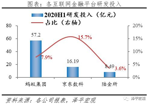 头部互联网平台去金融化,增加科技研发投入,提供金融服务解决方案。投入方面,2020年上半年,蚂蚁研发投入57.2亿元,占收入比重7.9%;京东数科研发投入16.19亿元,占收入比重15.7%。产出方面,蚂蚁集团在数据库和区块链领域的布局成果卓著,2019年和2020年上半年支付宝申请公开的全球区块链发明专利数量分别为1505项、1457项,全球位列第一;2019年蚂蚁自研的OceanBase数据库在被誉为“数据库领域世界杯”的TPC-C基准测试中,成为首个登顶该榜单的中国数据库产品。而京东数科重点在发展智能城市业务,例如京东以自研“智能城市操作系统”为指挥中心,打通南通市9个委办局、12个系统联动,打造危化品全流程监管创新应用;2019年10月京东与中储发展公司合资成立“中储京科”共同研发在大宗商品领域的“区块链+物联网”的应用技术。