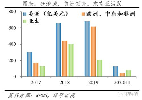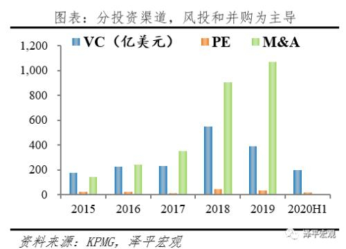 分投资渠道看,风投表现较为强劲。金融科技主要投资者包括VC、PE和并购,平均所占份额为40%、3%、41%。VC是风险投资机构对初创企业股权投资,是反映金融科技投资市场领先指标。近5年,VC支持的金融科技投资金额从178亿美元增至393亿美元,2020年上半年为200亿美元,超过同期水平。