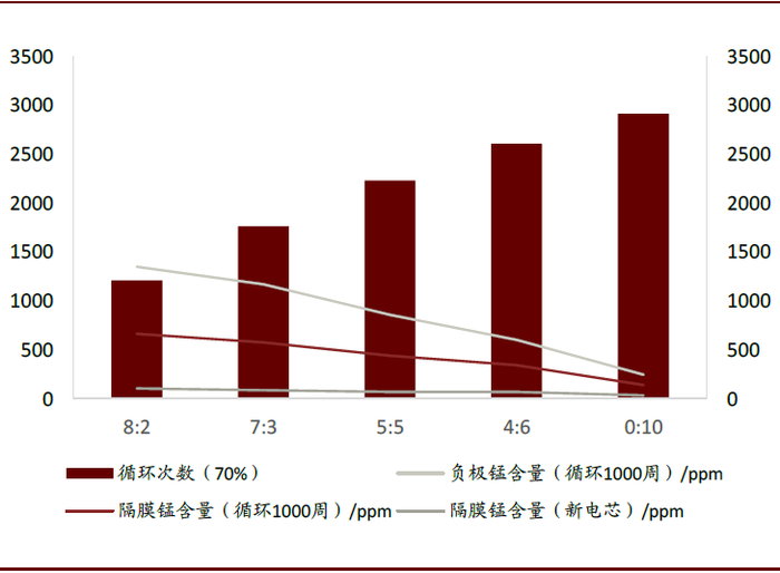 图表:锰酸锂和三元不同比例混合循环次数和锰溶出