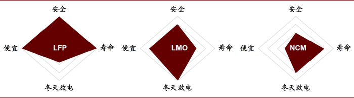 ►三元材料:具备能量密度高、循环性能好的优势,但存在安全性差、成本高的问题。