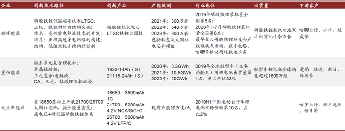在需求确定性成长之下,以鹏辉能源、星恒电源等为首的企业均看好两轮车锂电市场的未来发展,在技术端持续优化材料体系、推出具备高性价比的产品,在产能端积极扩产(鹏辉能源预计2021~23年分别实现300/640/900万套产能,星恒电源预计2020~22年分别实现6/11/20GWh产能),在客户端积极合作探索(鹏辉能源客户包括哈啰单车、小牛、超威等,星恒电源包括爱玛、雅迪、新日、绿源等),持续在享受行业红利的基础上巩固地位、稳健成长。