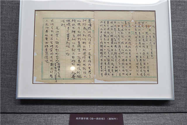 “他是幸运的,能得到我的爱,我真是非常爱他的哟!……谁把我的信带给他,把他的信带给我,谁就是我的恩人。”在9号楼一楼实物展示区的版面上有这样一段话,这是杨开慧与毛泽东1927年分离后所写,距离杨开慧牺牲只有10个月的时间,字里行间无一不透露出她对毛泽东深深的爱恋及思念。然而当这份手稿在杨开慧故居被发现时毛泽东已经离开人世,他终究没能收到爱妻沉甸甸的思念。这段文摘的下方,还有一份泛黄的手稿,名为《给一弟的信》。1929年当杨开慧得知朱德夫人被国民党残忍杀害挂头示众后,就感觉死亡如影随形,于是她写信给堂弟杨开明,希望托孤。但这份“遗嘱样的信”最终也没有寄出,直到1982年才重见天日。这些珍贵的文字,让观众得以走进杨开慧生命最后三年的内心世界,窥见了她作为革命者、作为妻子、作为母亲的心路历程。