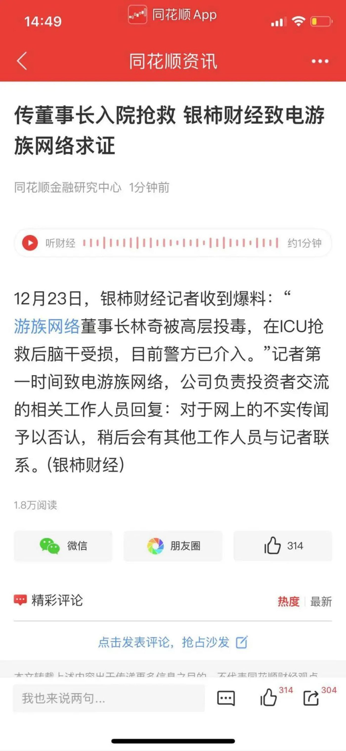 12月23日下午,有爆料称,游族网络董事长林奇被高层投毒,林奇经ICU抢救后脑干受损。娱乐资本论第一时间联系了游族网络,对方回应称:“林奇身体状况稳定,后续请等待官方公告。”事后人们回忆,12月17日时上海徐汇区华鑫中心附近就曾经听到了警笛环绕。