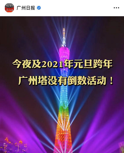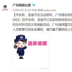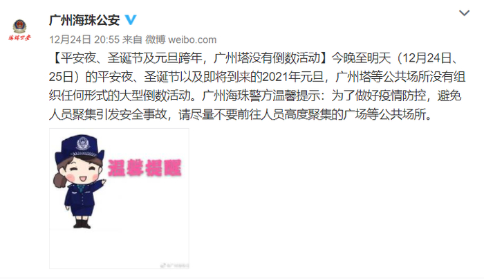 24日晚,@广州海珠公安 发布提醒:12月25日晚及即将到来的2021年元旦,广州塔等公共场所没有组织任何形式的大型倒数活动。
