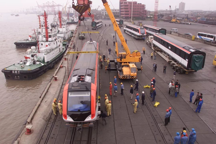2002年5月1日,地铁3号线(明珠线)首批从阿尔斯通公司进口的新式车辆抵达张华浜码头(王溶江摄)