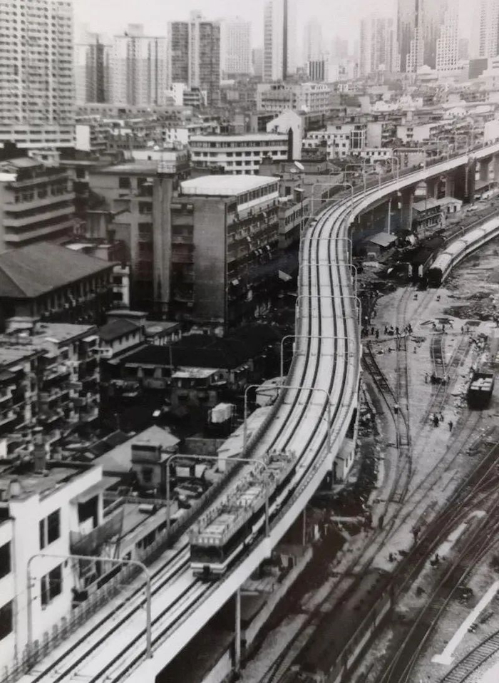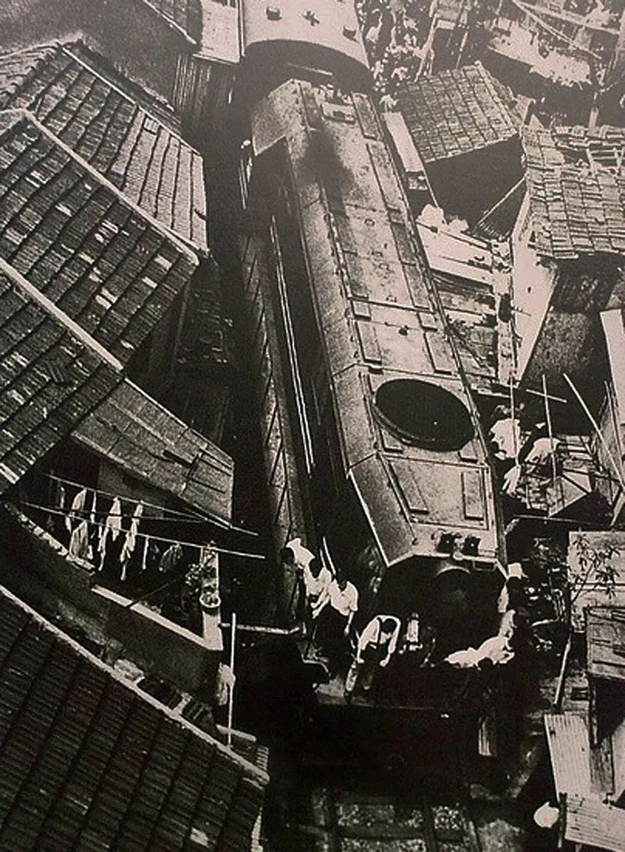 穿梭在棚户区的火车。20世纪八九十年代摄于上海老沪杭铁路内环线某段(推测为现今轨交3号线宜山路至中山公园段)。