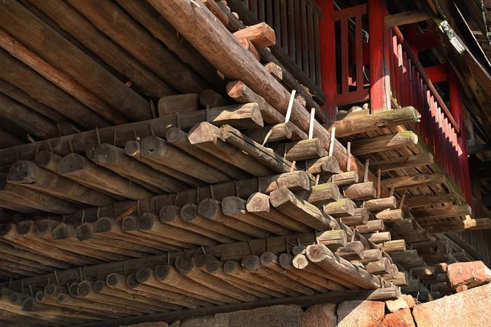 这种结构,不用钉铆,只需用相同规格的杆件,别压穿插,搭接而成。从力学上分析,上端的纵梁压在横梁上,横梁又压在相对一根纵梁上,上下两根纵梁夹住一根横梁,摩擦力使得横梁不得滑动,结构简单而奇妙,这种结构,整体为拱形结构,因此沿拱心线整体受压,不会产生弯矩,就每一根杆件来说,又是最简单的简支梁,承受两种集中荷载。