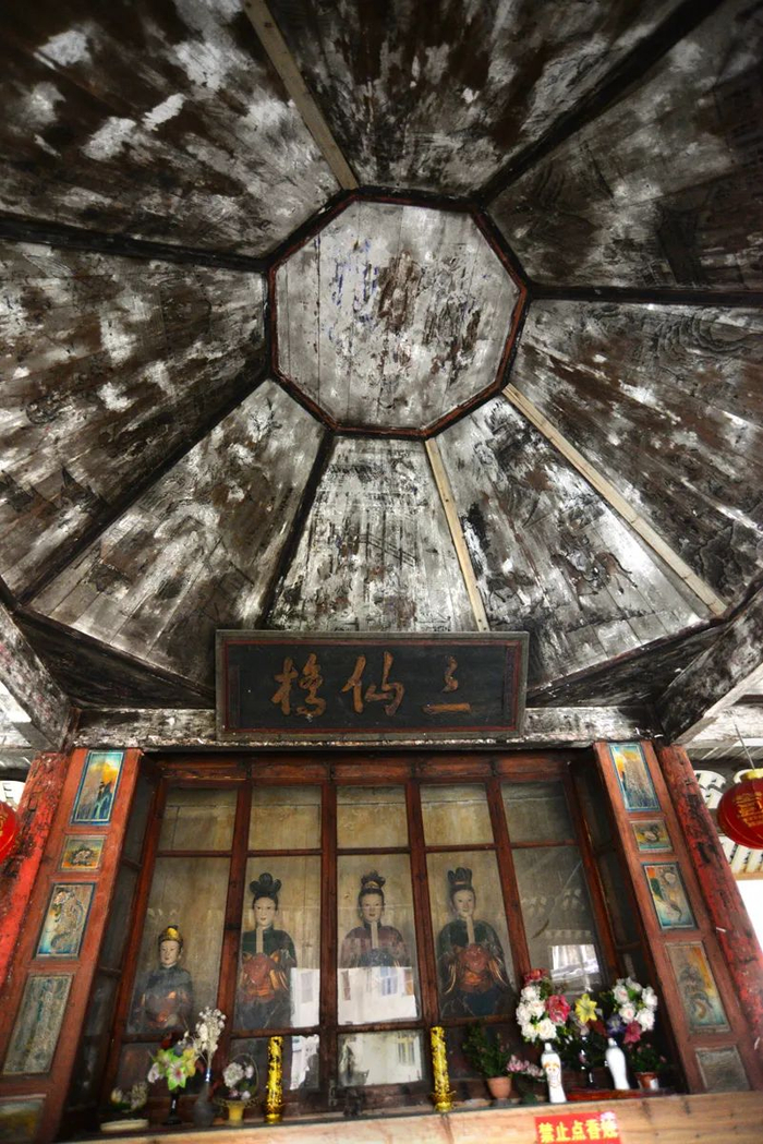 【三仙桥】位于周宁县纯池镇禾溪村,横跨湫溪之上,是福安通往闽北的交通要道。始建于明成化三年(公元1467年),民国6年(1917年)加宽修建。原名澄明桥,因桥内奉祀杨、柳、倪三位仙姑,故名“三仙桥”,又因桥正中廊屋与两端太子亭成工字形布局,并各饰瓴顶,俗称“三顶桥”。廊屋内有藻井,并绘有精美的壁画。2013年,三仙桥被列入《中国世界遗产预备名单》。
