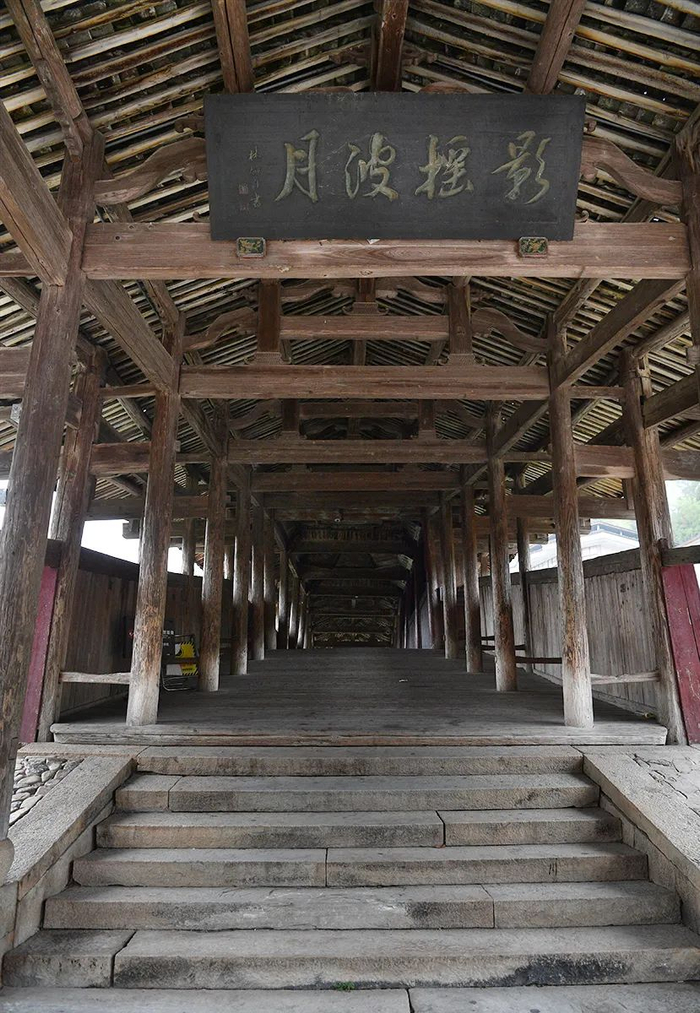 庆元县举水乡月山村的步蟾桥,也是典型的石拱廊桥,东北、西南走向,始建于明永乐年间,全长51.60米,净跨17.76米,拱高9.65米面阔5.20米,有廊屋18间,桥上设神龛供奉平水王大禹。桥身两侧鳞叠两层风雨挡板,屋面施枋椽,小青瓦合铺。
