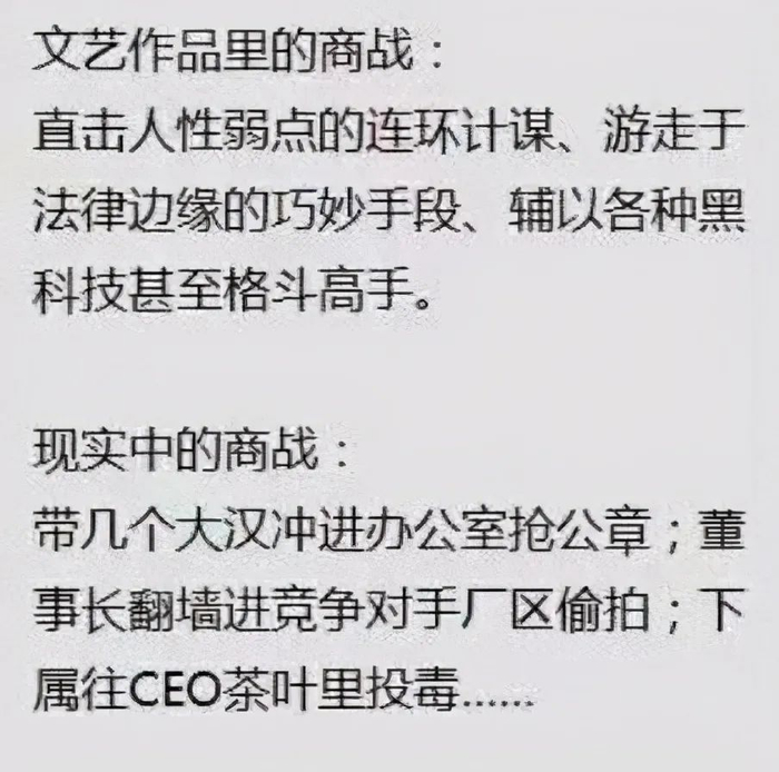 "文艺作品的商战,有直击人性弱点的连环计谋,游走于法律边缘的巧妙手段,还辅以各种科技甚至格斗高手。"有网友评论,现实中的商战则不然,投毒、抢公章、砍人都是亲自动手。